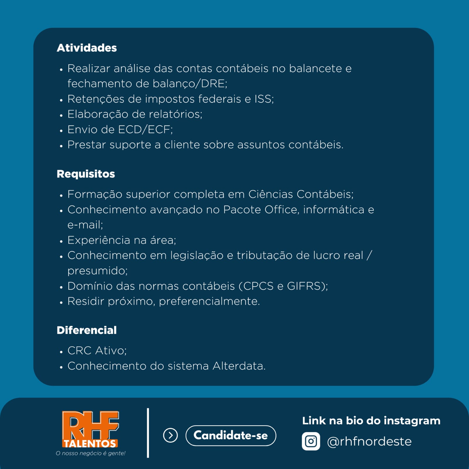 Formação: Cursando ou concluído Ciências Contábeis.